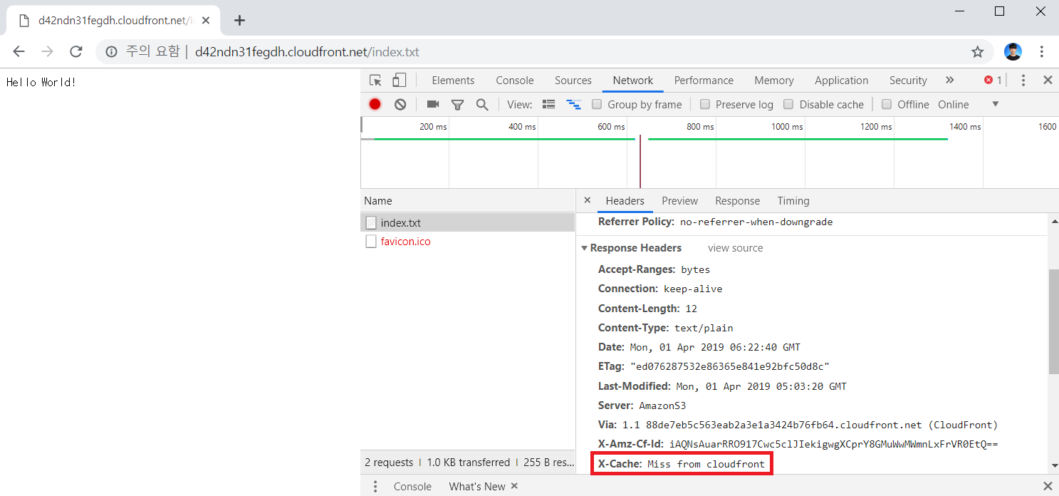 이제 다음과 같이 클라우드 프론트의 URL을 이용해 index.txt를 확인할 수 있게 되었습니다. 맨 처음에 특정 리소스에 접근하려고 하면 아직 CDN 서버에 퍼지지 않았기 때문에 [Miss from cloudfront]라는 캐시를 확인할 수 있습니다.