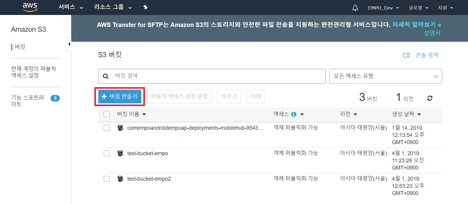 AWS S3에서는 [버킷 만들기] 버튼을 눌러서 버킷을 생성할 수 있습니다. 쉽게 말하면 하나의 프로젝트를 생성해주는 것입니다.