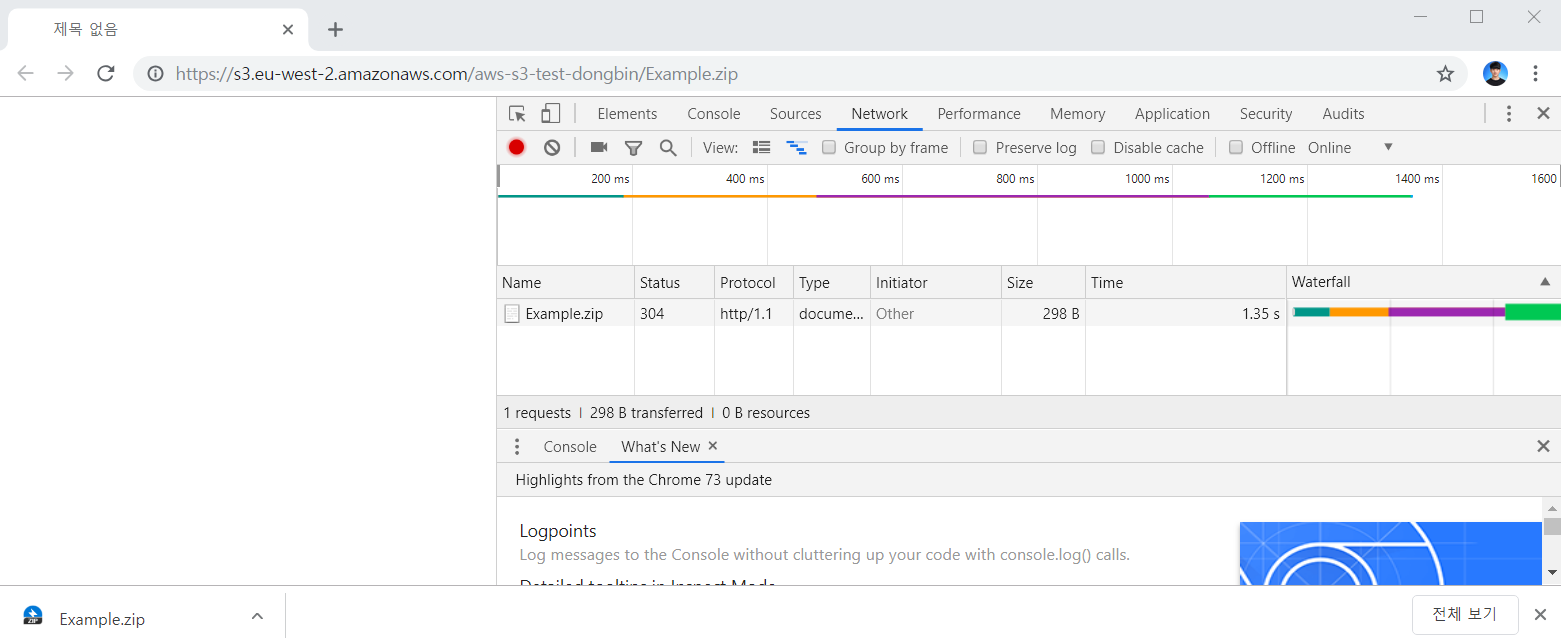 이제 [퍼블릭으로 설정]을 진행하지 않은 Example.zip 파일에 대해서도 URL 경로에 접속하면 다운로드를 받을 수 있게 되었습니다. 다시 말해 모든 파일에 누구든지 접근하여 다운로드 받을 수 있도록 설정한 것입니다.