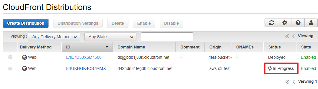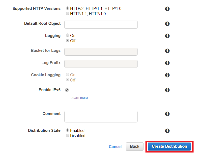 이후에 기본 설정으로 바로 [Create Distribution]을 눌러 배포를 진행합니다.