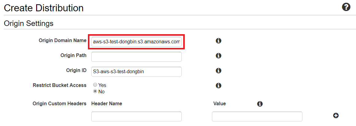 이후에 배포하고자 하는 대상(Origin Domain Name)으로 우리의 S3를 설정합니다.