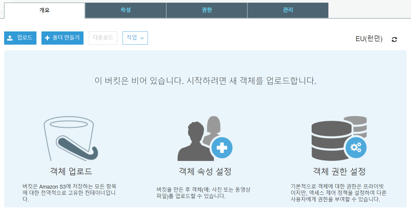 - 리전(Region)은 일반적으로 S3을 사용하는 사용자와 가까운 위치가 되도록 설정합니다. 다만 저는 Cloud Front의 성능을 측정하기 위해서 EU(런던)으로 설정했습니다.