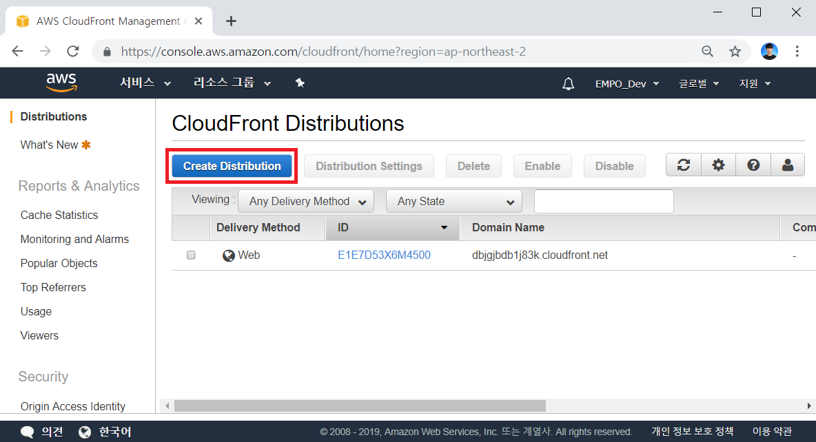 이제 Cloud Front을 이용하여 더 빠르게 리소스를 제공할 수 있도록 하겠습니다. 따라서 Cloud Front 콘솔로 이동합니다. 그리고 [Create Distribution]을 누릅니다.