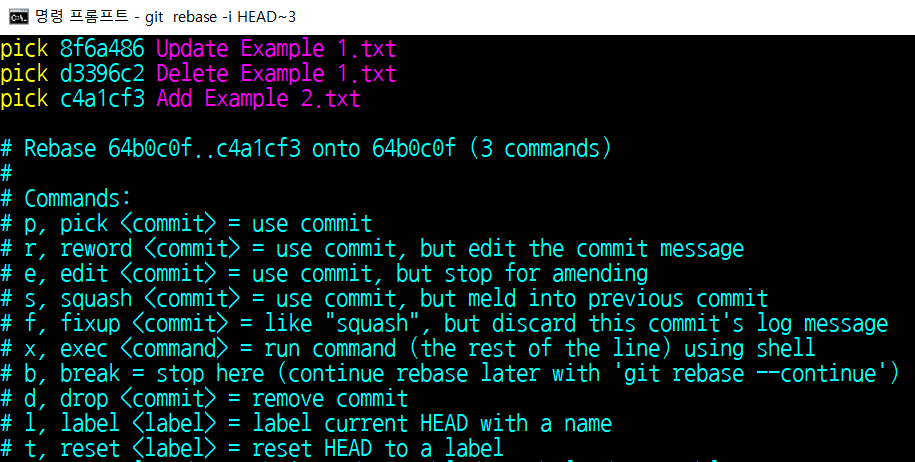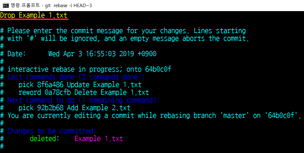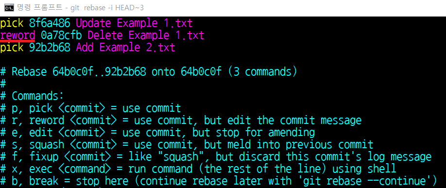 커밋 메시지를 바꾸고 싶을 때는 reword 키워드를 이용하면 됩니다. 저는 [Delete Example 1.txt] 커밋의 메시지를 수정해보도록 하겠습니다.