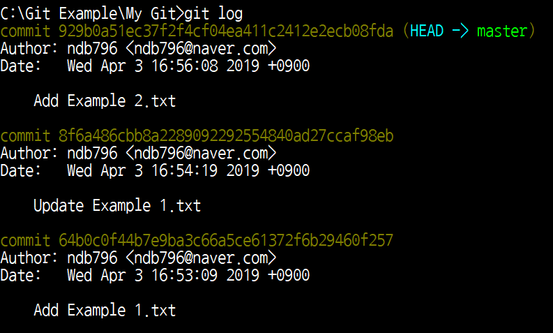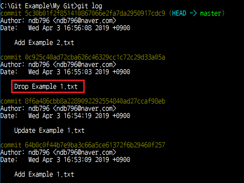 이제 깃 로그를 확인해 보시면 다음과 같이 총 4번의 커밋이 이루어져 있는 것을 확인할 수 있습니다. 저는 중간에 있는 [Delete Example 1.txt] 커밋의 메시지를 수정해보도록 하겠습니다.