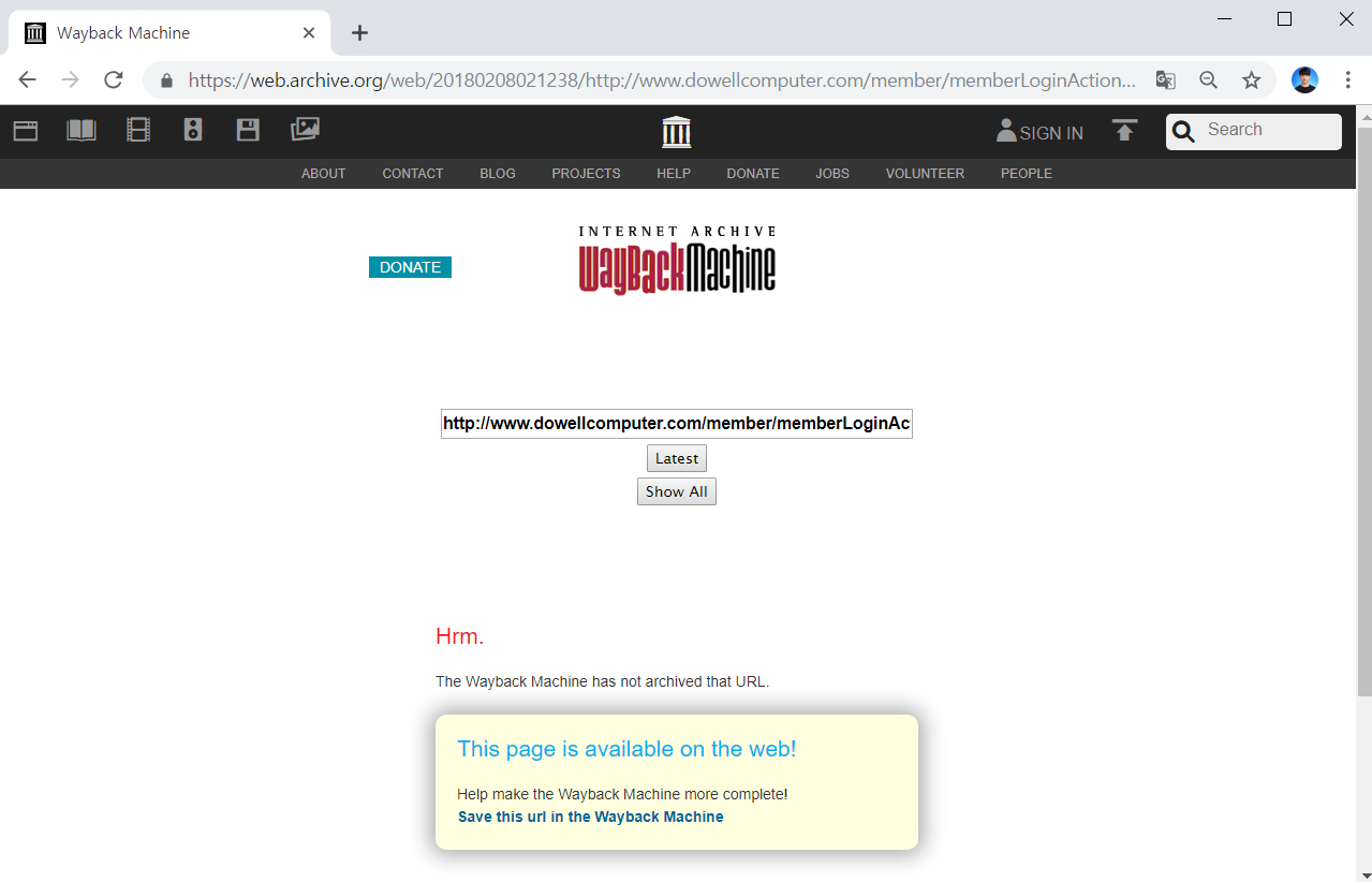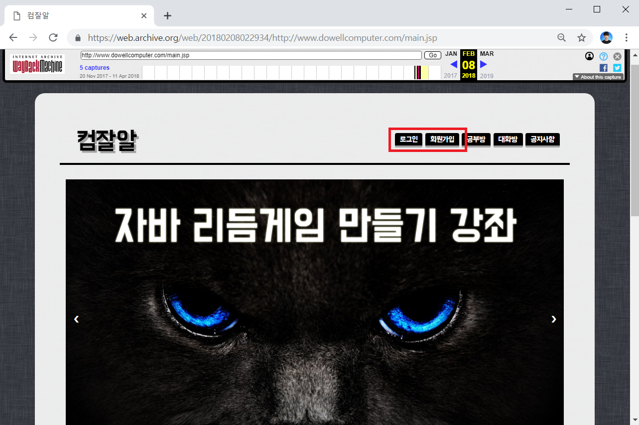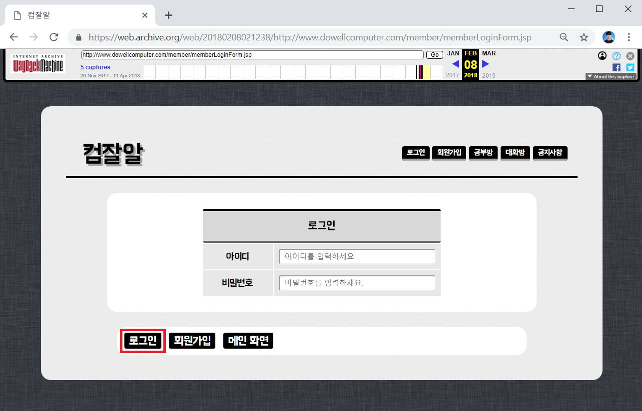 그러면 위와 같이 웹 사이트의 아카이브를 확인할 수 있습니다. 재미있는 점은, 웹 아카이브 서비스는 정적 페이지에 한해서 페이지 이동 기능도 제공한다는 것입니다. 실제로 저는 [로그인] 페이지로 이동해보았습니다.