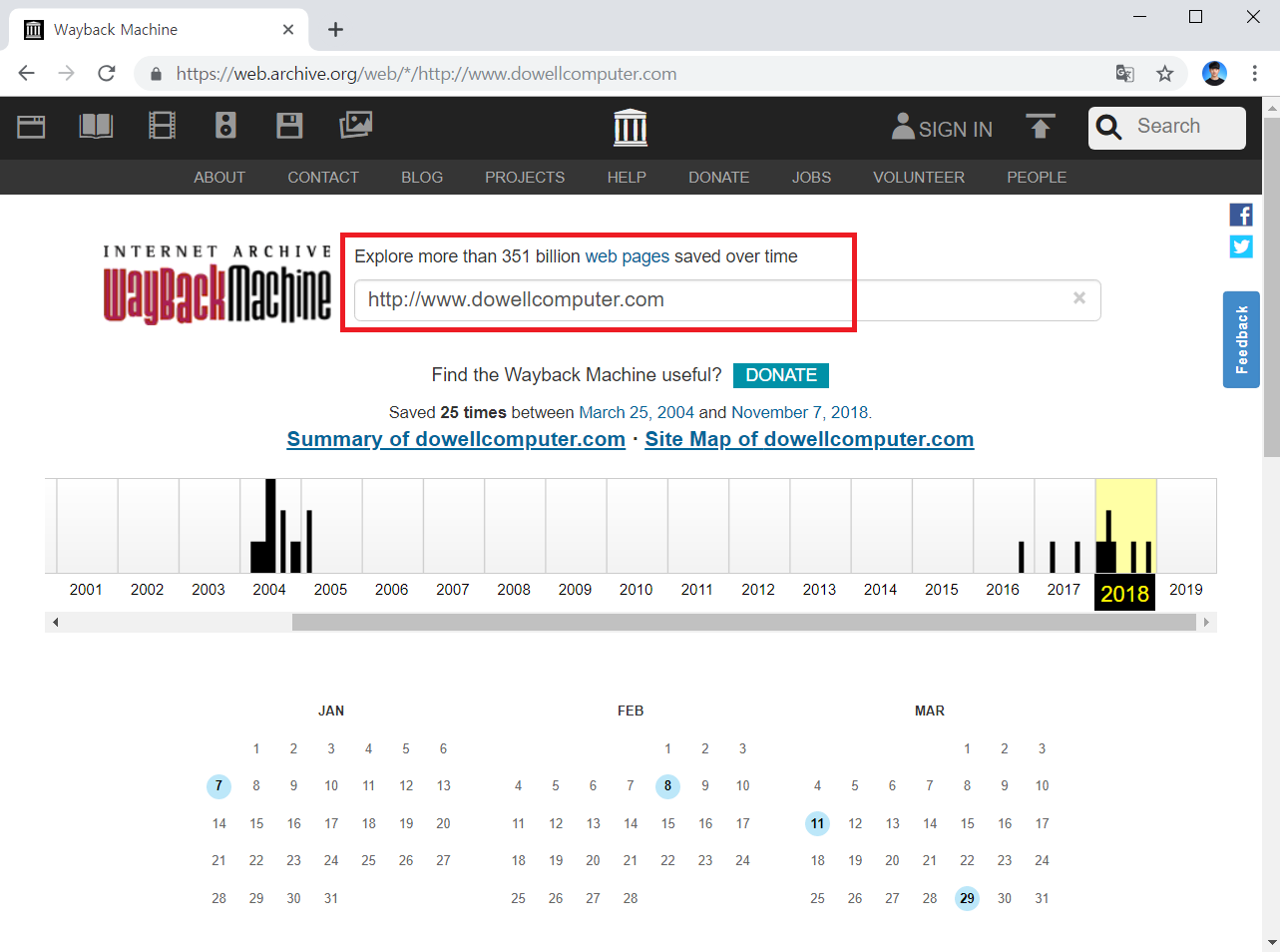 웹 사이트를 입력하면, 해당 웹 사이트에 대한 날짜별 아카이브 정보를 확인할 수 있습니다.