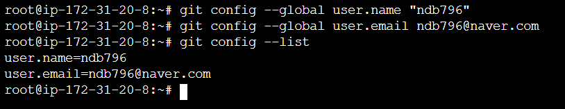 저는 확인 결과 어떠한 환경설정도 이루어지지 않은 상태인 것을 알 수 있었습니다. 따라서 이 때는 계정(user.name)과 이메일(user.email) 설정을 진행해주시면 됩니다. 저는 다음과 같이 제 깃 허브(Git Hub) 계정과 동일하게 계정명과 계정 이메일을 설정해주었답니다.