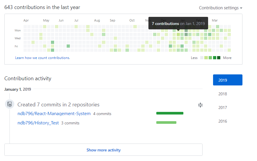 저는 다음과 같이 2019년 1월 1일의 날짜로 커밋 내역을 변경했습니다.