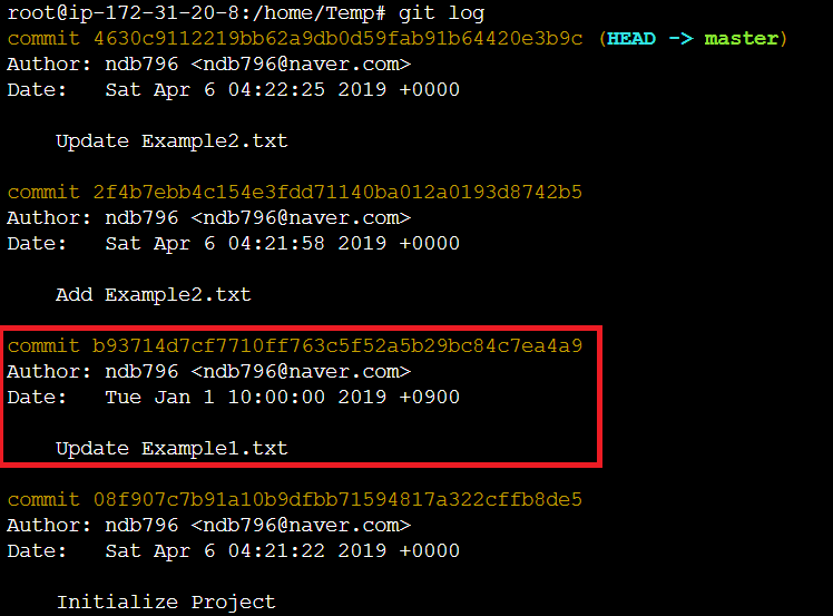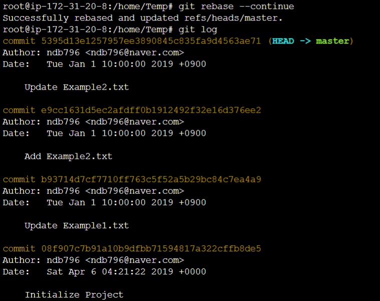 적용 이후에 실제로 깃 로그(Log)를 확인해보시면 다음과 같이 변경되어 있는 것을 확인할 수 있습니다. 그와 더불어 변경된 커밋 이후의 커밋들의 해시 값까지 모두 변경되어 있는 것을 확인할 수 있습니다.