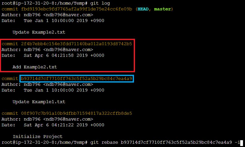 기본적으로 rebase 명령어를 이용할 때는 변경하고자 하는 커밋의 이전 커밋을 기준으로 하여 -i 옵션(인터렉티브)으로 에디터 창을 열어주시면 됩니다.
