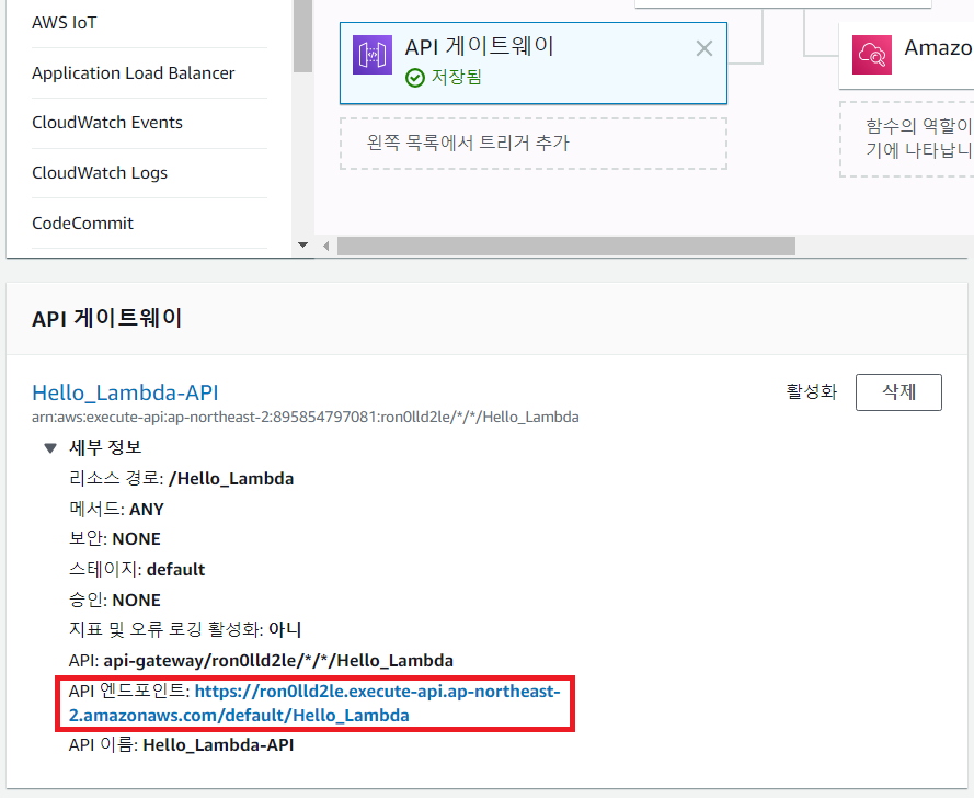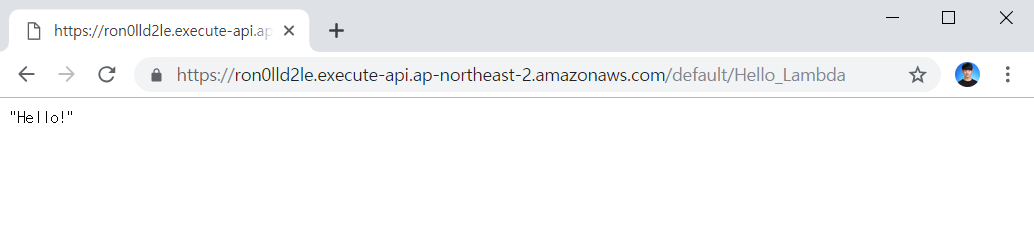 이제 우리의 Hello_Lambda-API의 '세부 정보'를 눌러보시면, API 엔드 포인트가 보입니다. 이 주소가 바로 우리의 웹 서버 경로라고 보시면 돼요. 저는 URL 주소가 https://ron0lld2le.execute-api.ap-northeast-2.amazonaws.com/default/Hello_Lambda 라고 나오네요. 이에 접속해보니 성공적으로 "Hello Lambda!"라는 문자열이 반환된 것을 알 수 있습니다.