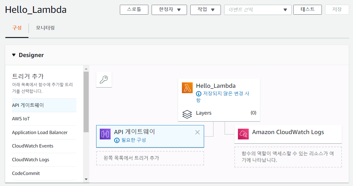 이제 ‘저장’ 버튼을 눌러주세요. 그럼 이제 실제로 트리거(Trigger)를 설정해서 클라이언트의 요청(Request) 데이터가 AWS 웹 서버로 전송되도록 해보겠습니다. 이 때는 API 게이트웨이라는 것을 사용할 수 있어요. 일종의 웹 서버 처럼 동작하는 기능이에요. API 게이트웨이를 눌러서 트리거로 두시면, 아래쪽에 트리거 설정이 가능해요.