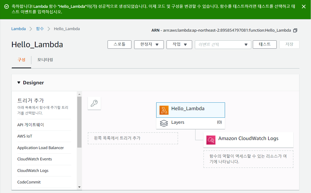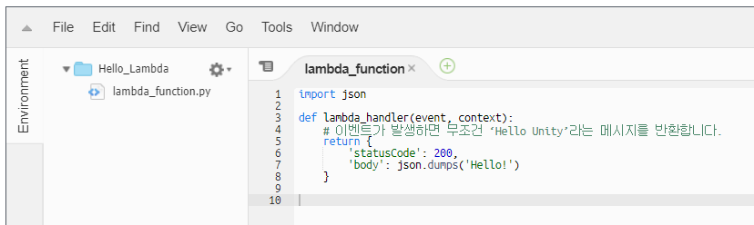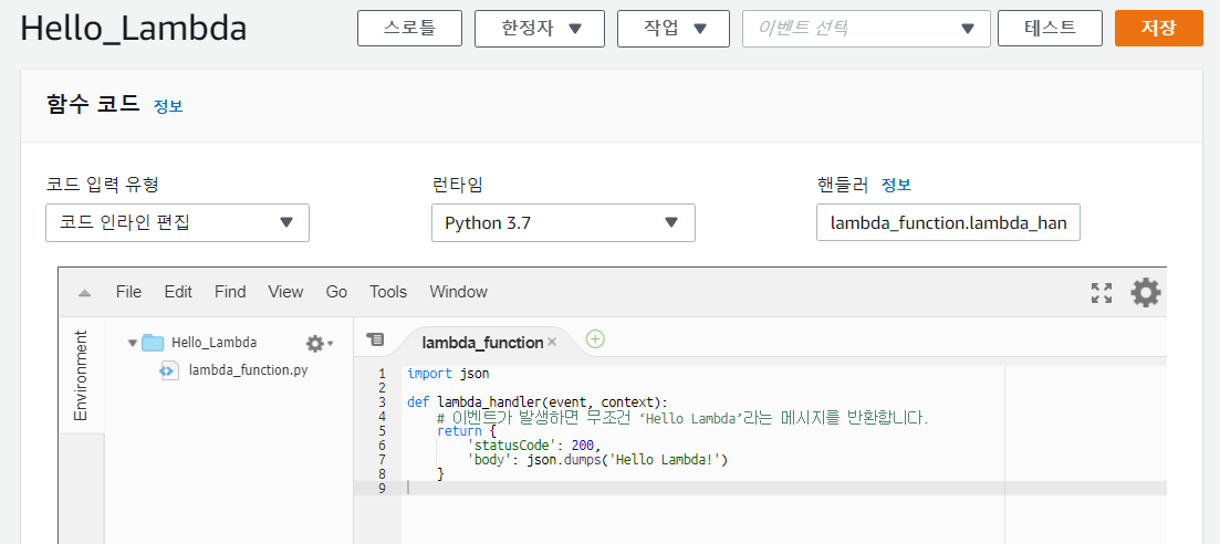 # 이벤트가 발생하면 무조건 ‘Hello Lambda’라는 메시지를 반환합니다.