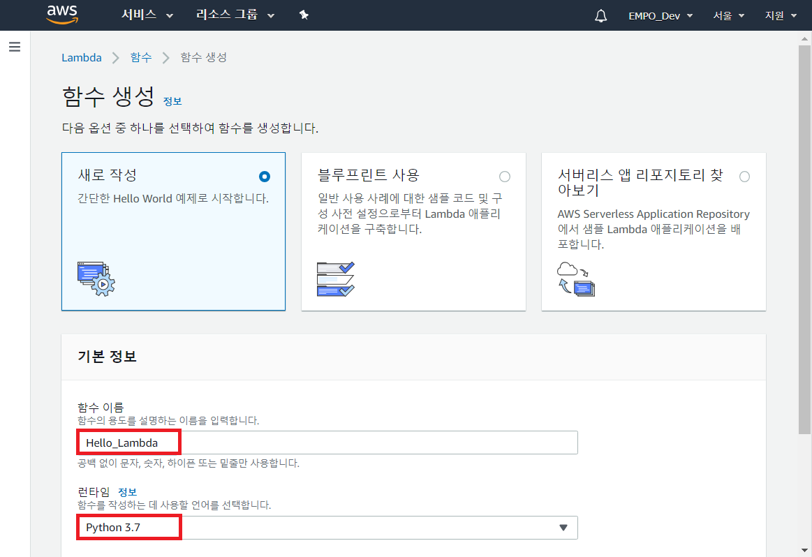 이제 람다 함수의 이름을 Hello_Lambda로 설정하고, 런타임 언어를 Python 3.7을 설정합니다. 보시면, 프로그래밍 언어를 C#으로 설정할 수도 있는데요, 여기에서 말하는 C#은 .Net 프레임워크라고 하여 기본적인 C#에 비해서 난이도가 높아요. 설정해야 되는 것도 많아요. 그래서 일반적으로는 AWS 람다 함수를 만들 때에는 node.js 혹은 python이라는 언어를 많이 선택합니다. 여기서 node.js는 쉽게 말하면, 자바스크립트라고 보시면 되는데요. 이것도 웹 개발 언어에 가까우므로 우리는 python을 선택해서, 가장 쉬운 방향으로 진행하도록 할게요.