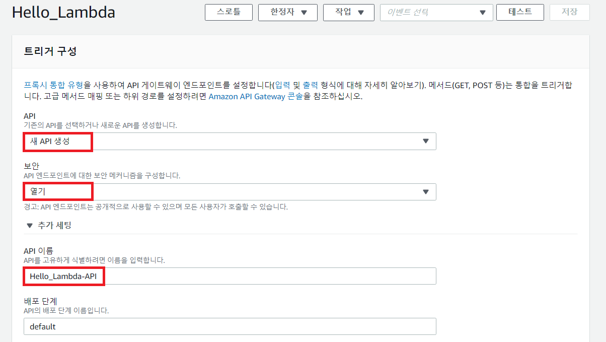 가장 먼저 '새 API 생성'으로 해줄게요. 이후에 '보안'은 '열기'로 설정해줍니다. 그리고 '추가 세팅'을 눌러서 API 이름을 'Hello_Lambda-API'라고 설정하고, ‘추가’를 해서 ‘저장’을 진행하시면 됩니다. 저장이 완료되면 비로소 API 게이트웨이가 동작하는 상태가 됩니다.