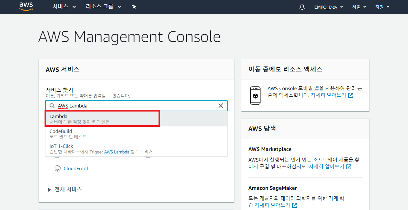 이제 위와 같이 ‘서비스 검색’ 창에서 ‘AWS Lambda’를 검색해보도록 합시다. AWS는 정말 많은 서비스를 지원하고 있어요. AWS Lambda 말고도, 정말 많은 서비스가 있지만 사람들이 많이 사용하는 서비스는 몇몇으로 정해져 있어요. 그 중에서 람다가 많이 사용되고 있는 것이랍니다.
