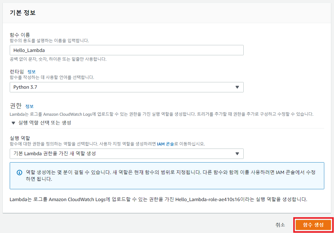 또한 권한 설정은 기본 설정 그대로 [함수 생성]을 진행하시면 됩니다.