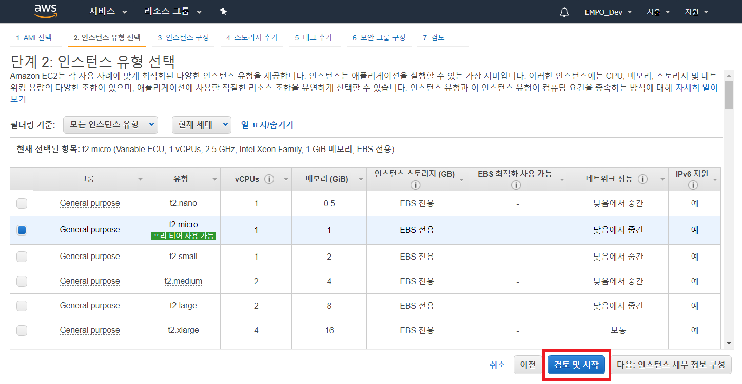 이제 원하는 인스턴스 유형으로 [검토 및 시작] 하시면 됩니다.