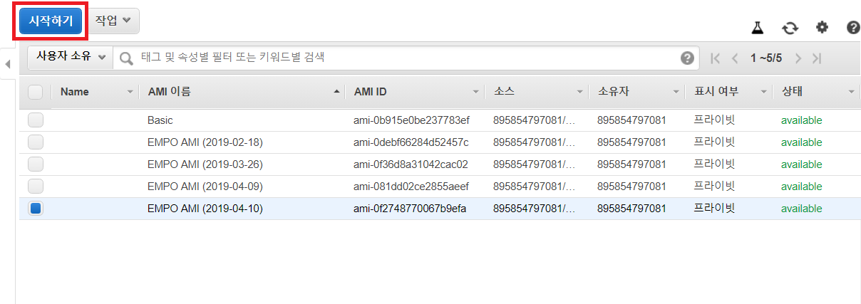 이제 [이미지] 탭의 [AMI] 탭으로 가서 우리가 만든 이미지로 인스턴스를 생성해 봅시다. 원하는 이미지를 클릭한 뒤에 [시작하기] 버튼을 누르시면 됩니다.