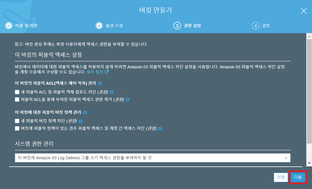 다른 구성은 기본 설정대로 진행하시고 간단한 실습을 위해 [권한 설정] 탭에서는 모든 체크를 해제해주겠습니다.