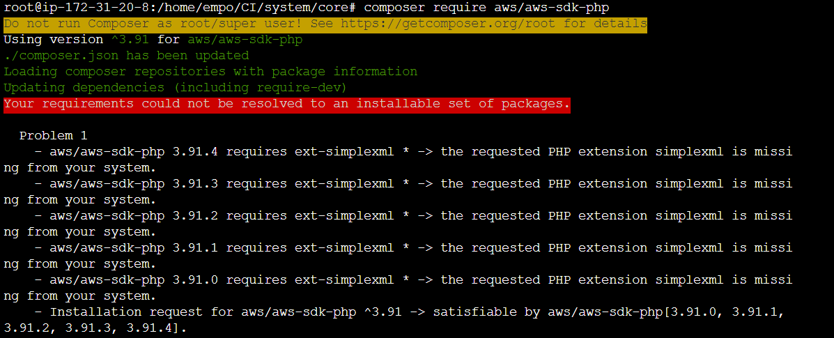 특정한 PHP 라이브러리를 설치할 때 다음과 같은 오류를 만날 수 있습니다. 이는 흔히 PHP AWS SDK를 설치하시는 분이 만날 수 있는 오류인데요. PHP AWS SDK는 simplexml이라는 이름의 확장 프로그램(Extension)을 사용합니다. 그래서 simplexml이 설치되어 있지 않은 분들은 다음과 같은 오류가 출력되는 것입니다.