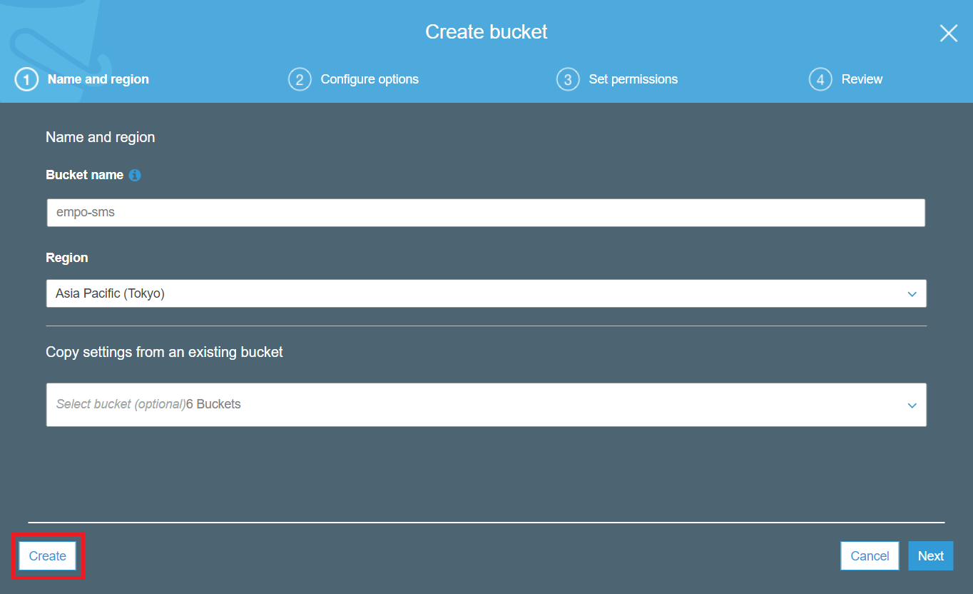 AWS 문자 메시지(SMS) 로그는 S3에 저장할 수도 있습니다. 이를 위해서 AWS S3 서비스에서 [Create Bucket]을 눌러서 하나의 새로운 버킷(Bucket)을 만들 수 있습니다.