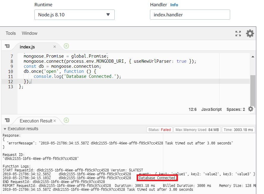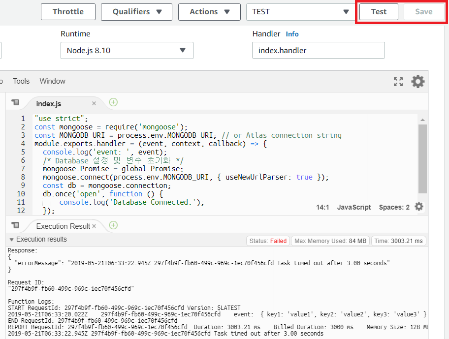이제 이 상태에서 다시 AWS Lambda를 [Save]하고 [Test]하면 이제 Mongoose를 사용할 수 있게 되는 것을 알 수 있습니다.