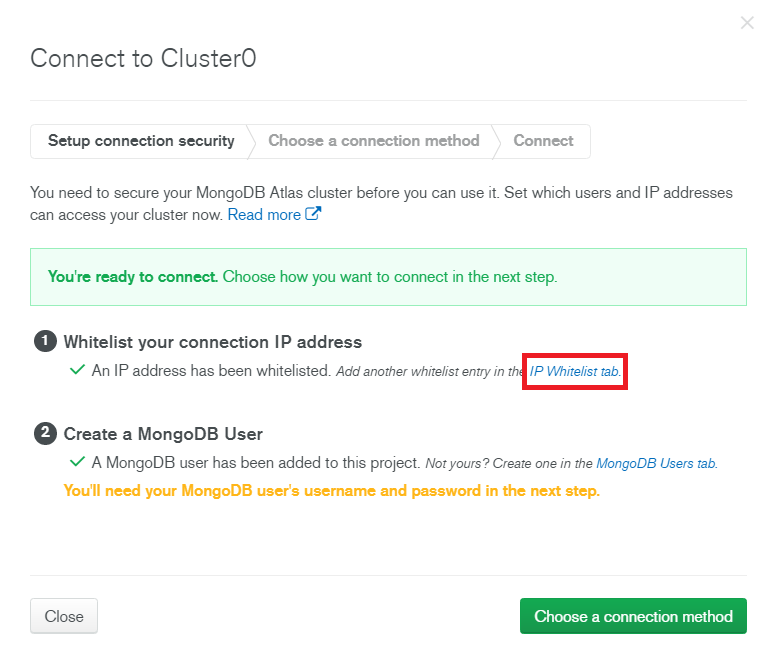 다만 이 때 위와 같이 정상적으로 DB 접근이 되지 않아서, 'Database Connected.' 라는 로그(Log)가 출력되지 않으면, Atlas에서 DB White List 설정을 확인하실 필요가 있습니다. 혹은 MongoDB 비밀번호가 제대로 입력이 되어 있는지 확인하실 필요가 있습니다.