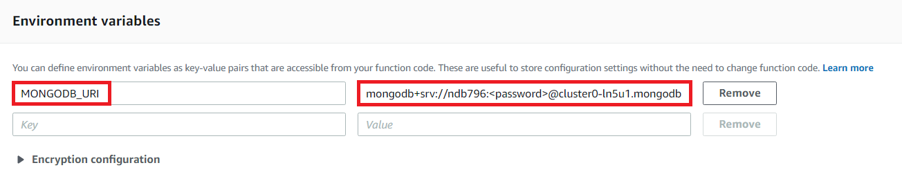 가장 먼저 AWS Lambda의 환경 변수(Environment Variables)로 MONGODB_URI을 설정합니다. 이 때 <password> 부분에 자신의 MongoDB 비밀번호를 넣어주셔야 합니다.
