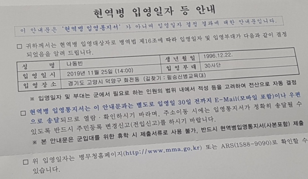 흔히 대학을 졸업할 때까지 군대를 가지 않은 사람이, 6개월 정도 대학원이나 창업을 준비하고 있는 상태일 수 있습니다. 이 때는 다음과 같이 생긴 [현역병 입영일자 등 안내] 편지를 받을 수 있습니다. 저는 향후 이번년도 9월부터 공대에서 대학원 석사 과정을 진행하게 될 예정인데, 입대하라는 안내를 받은 것이므로 당황스러웠습니다.