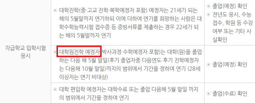 저는 확인을 해보니까 [대학원진학 예정자] 항목으로 입영 연기를 할 수 있다고 안내가 됩니다. 저는 실제로 대학원 합격 및 컨택까지 완료가 된 상태이므로, 무난히 입영 연기를 할 수 있습니다.