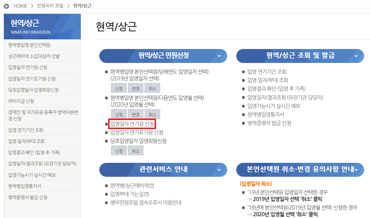 올바른 경로: [병무청 홈페이지 → 병무민원포털 → 현역, 상근입영 → 입영일자 연기원 신청]