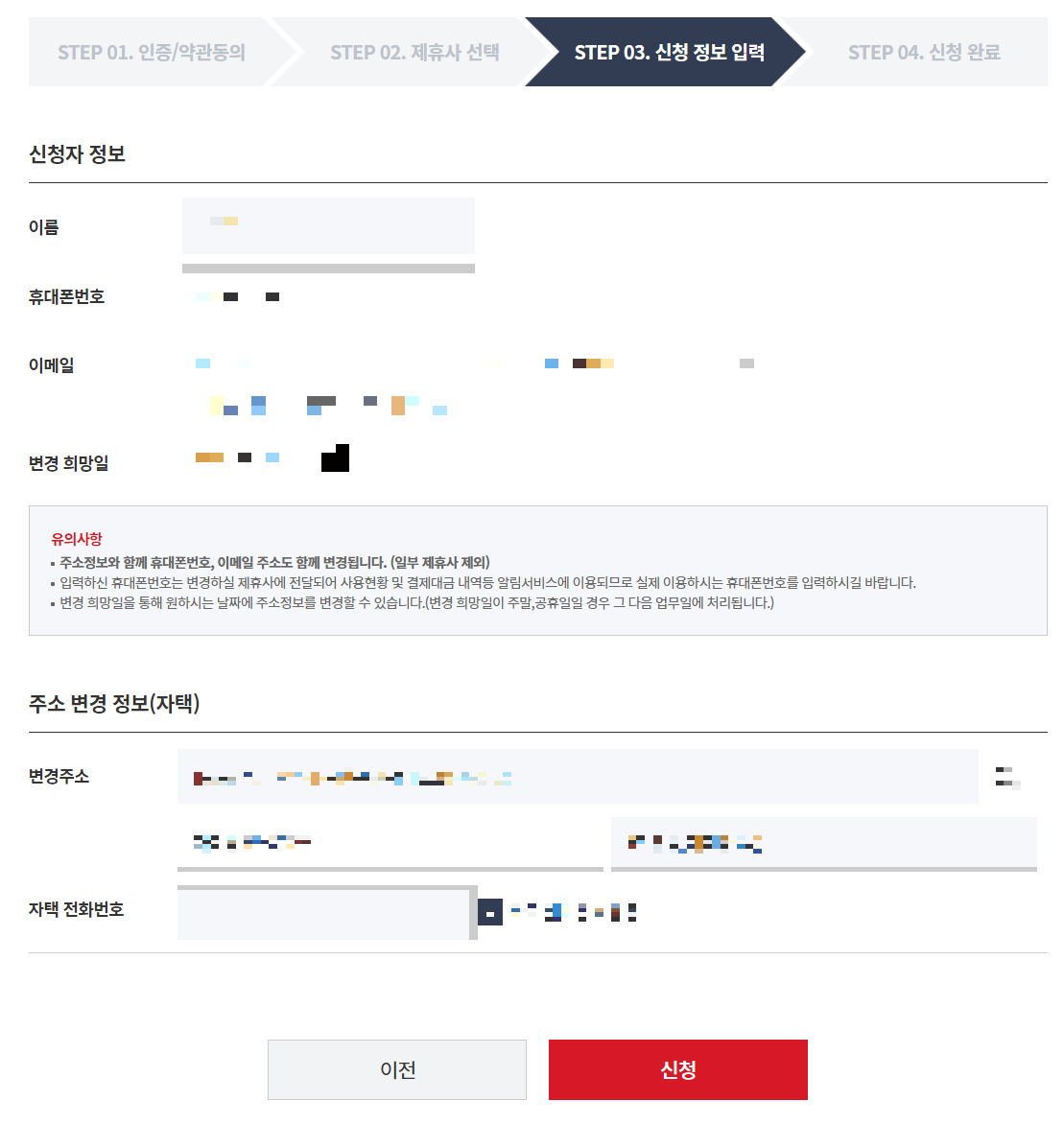 이제 신청 정보를 입력합니다. 본인의 휴대폰 번호, 이메일 주소 등을 확인합니다.