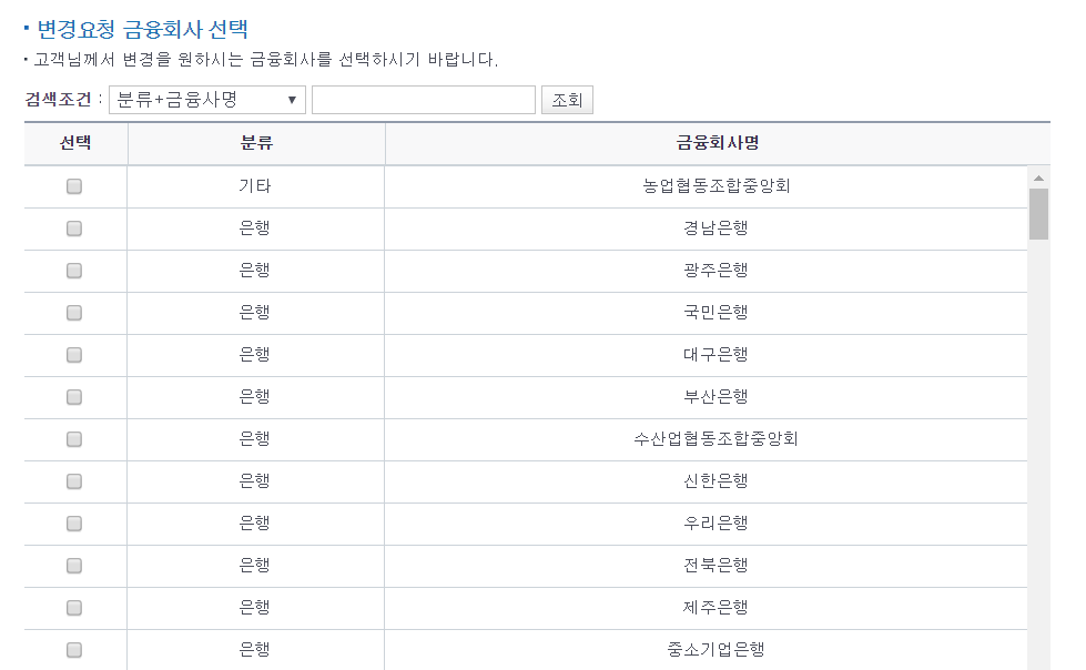 이후에 화면에 나오는 대로 지시에 따르시고, 금융회사를 선택하여 일괄적으로 변경 요청을 진행하시면 됩니다.