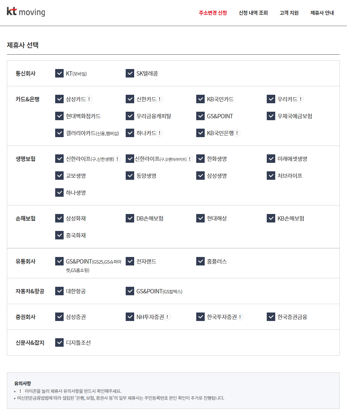 KT Moving 서비스 제휴사를 선택합니다. 필자는 번거롭게 느껴져서 그냥 전체 선택했습니다.