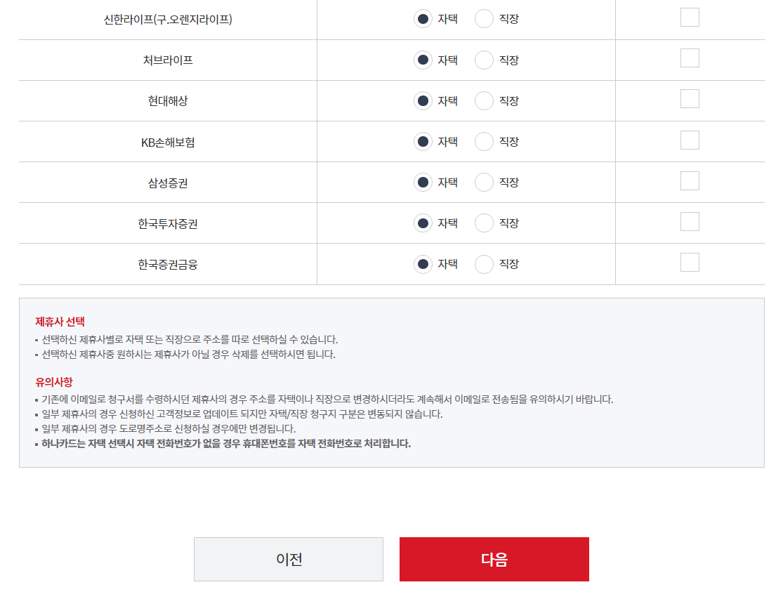필자는 [자택] 주소가 변경된 것이므로, 전부 자택으로 선택했습니다.