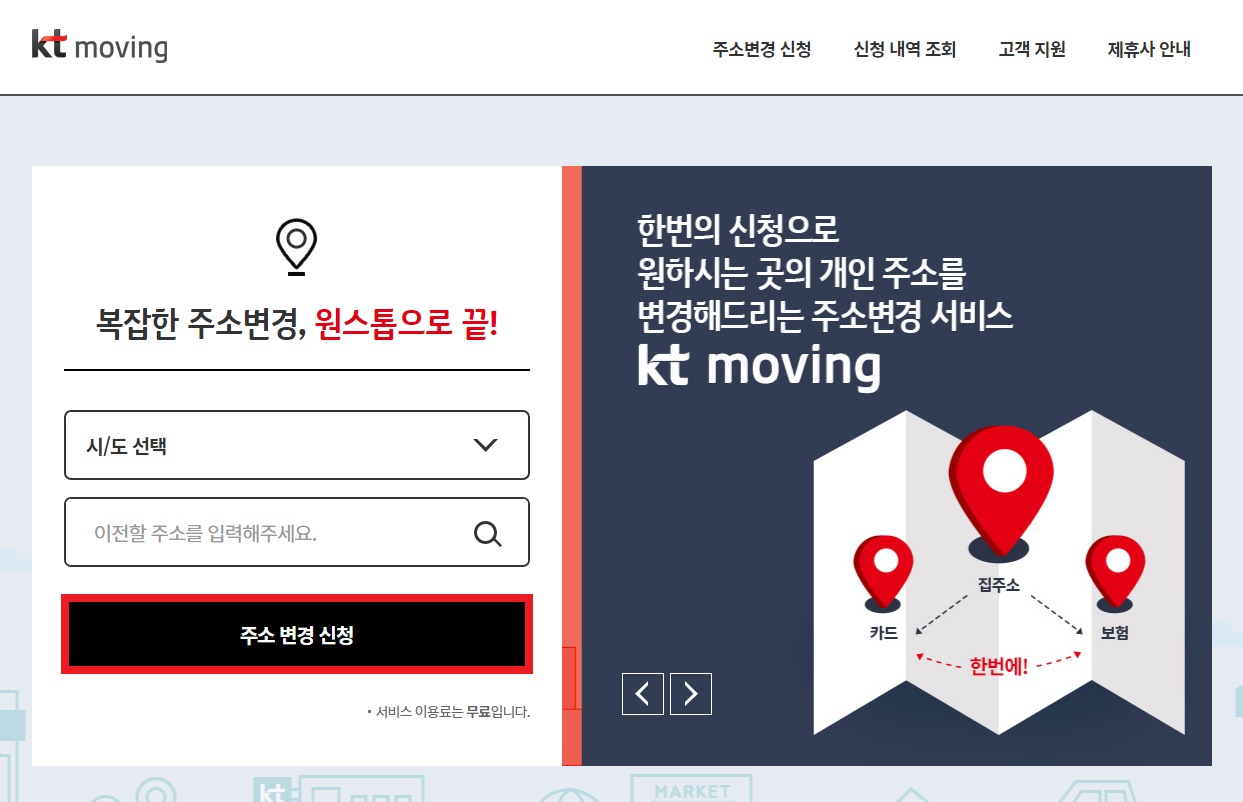 흔히 이사를 갈 때 주소 변경을 하는 것은 귀찮은 작업이 될 수 있습니다. 이때 주소 변경을 일괄적으로 도와주는 서비스가 있습니다. 대표적인 서비스로는 KT Moving이 있습니다. 이름은 KT Moving인데 실질적으로는 상당히 많은 카드사 및 통신사와 제휴가 되어 있기 때문에, 이 서비스만 이용해도 상당히 많은 불필요한 과정을 줄일 수 있습니다.
