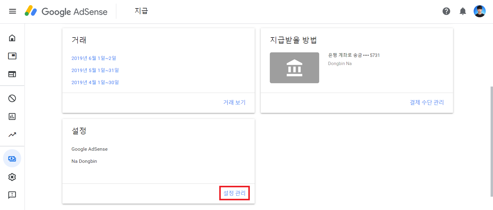 구글 애드센스와 같이 외국 기업과 관련한 서비스는, 주소를 일일이 변경해주실 필요가 있습니다. 구글 애드센스의 주소를 변경하는 경우 애드센스에 로그인을 하신 뒤에 [지급] 탭으로 이동하시면 됩니다. 이후에 [설정 관리]를 진행합니다.
