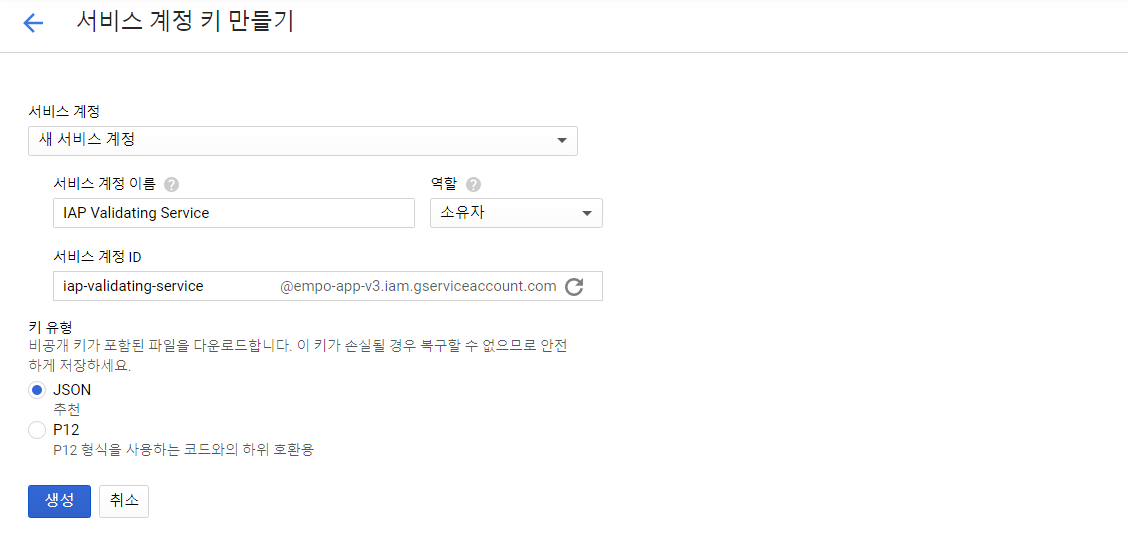 이후에 [새 서비스 계정]을 선택한 뒤에 [서비스 계정 이름]을 설정합니다. 그리고 역할은 [소유자]로 선택할 수 있습니다. 이제 [생성] 버튼을 눌러서 JSON 파일을 생성하시면 됩니다. 생성 이후에는 JSON 파일이 생성되므로, 이 파일을 저장해주세요. 향후 서버에서 이 JSON 파일을 이용하여 구글 인 앱 결제 인증을 수행할 수 있습니다.
