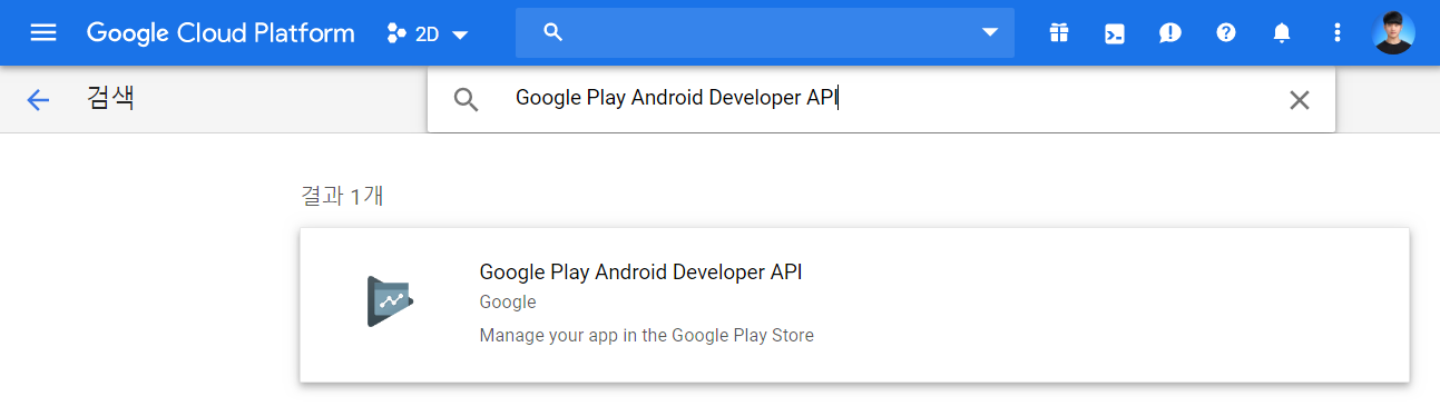 이후에 다음과 같이 [Google Play Android Developer API]를 검색하여 확인할 수 있도록 합니다.