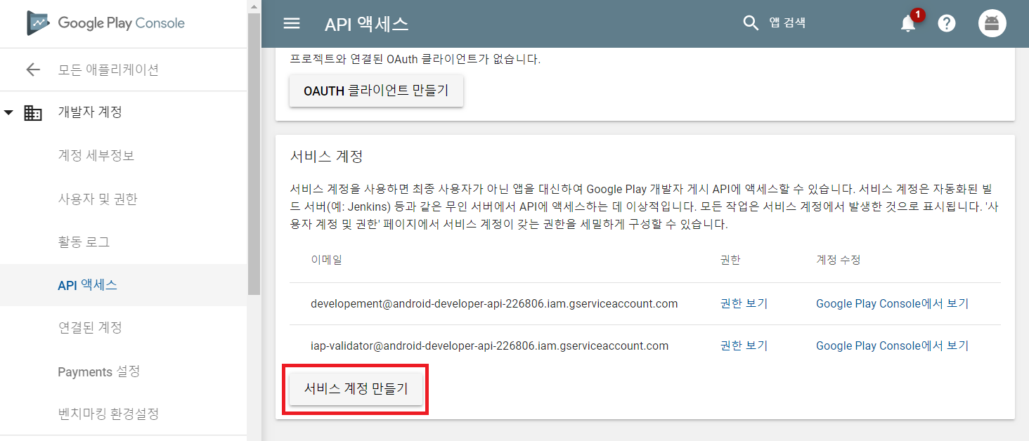 이후에 [Google Play Android Developer API]를 사용하겠다고 설정하시면 됩니다.