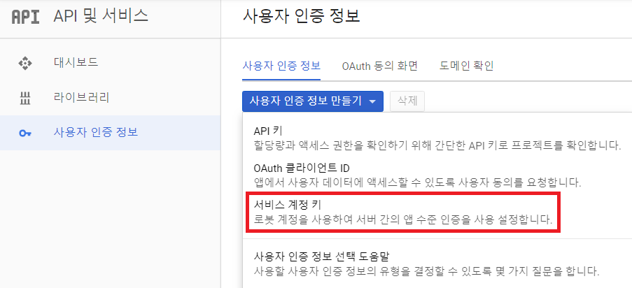 따라서 [사용자 인증 정보]로 이동한 뒤에 [사용자 인증 정보 만들기]를 눌러 [서비스 계정 키] 탭에 들어갑니다.