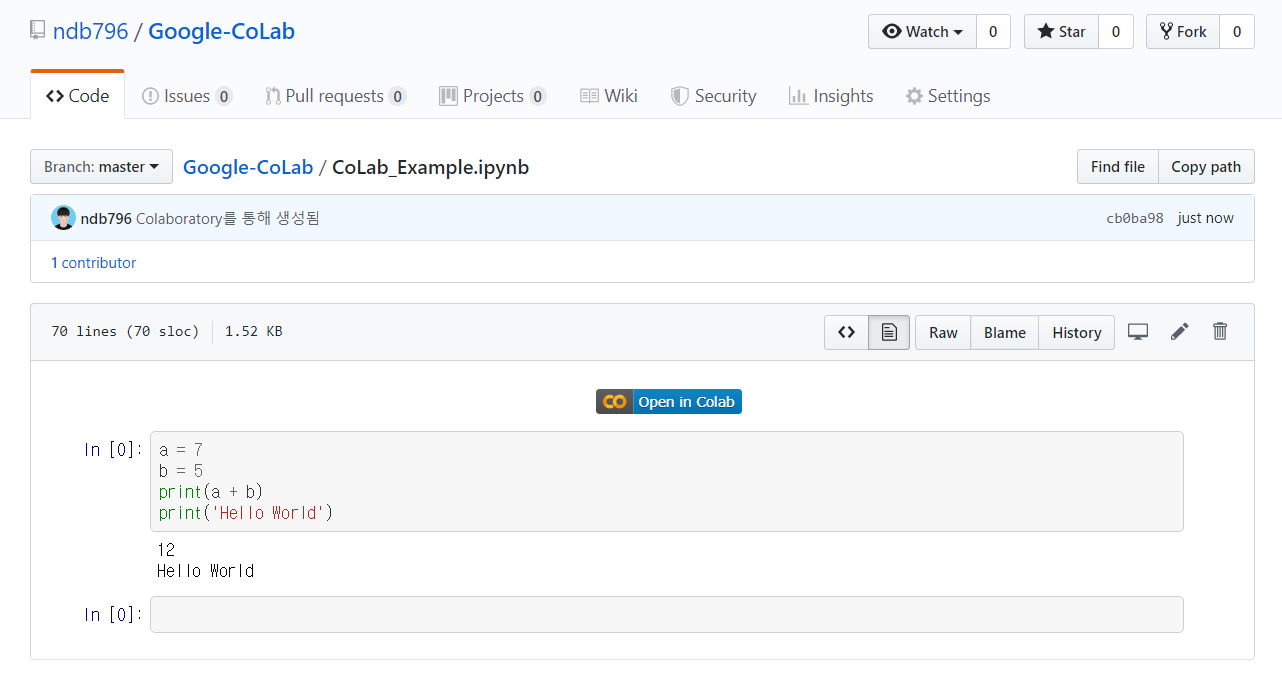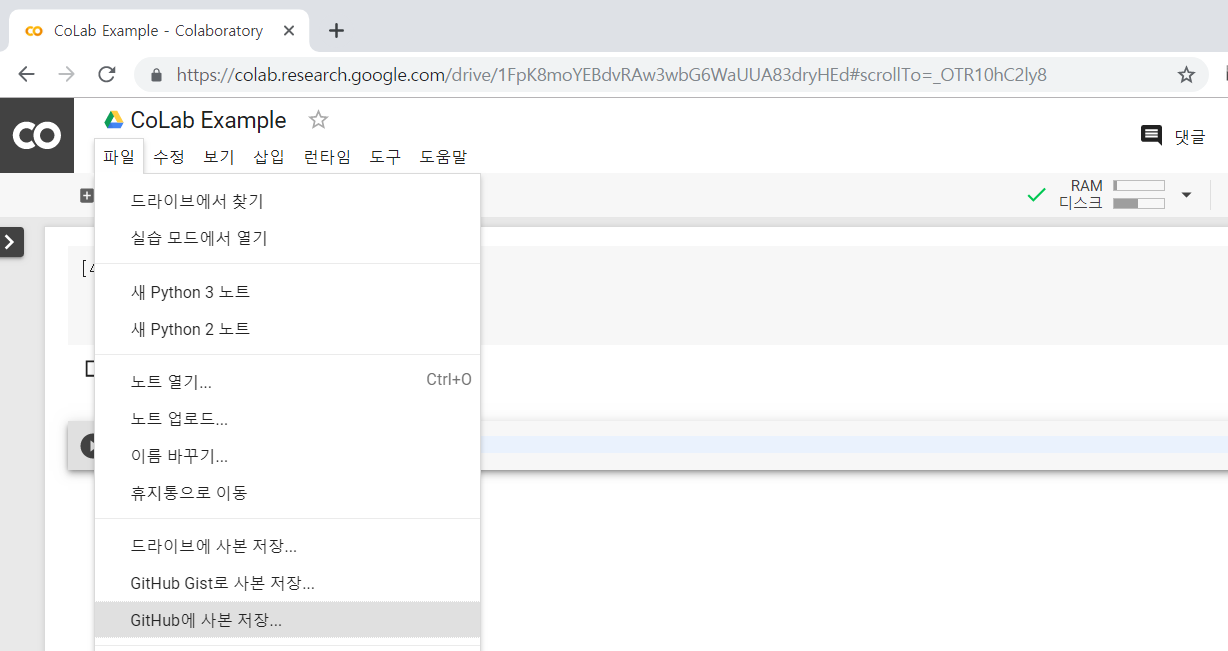 Google Colaboratory의 가장 큰 장점 중 하나는 소스코드를 손쉽게 공유할 수 있다는 점입니다. 특히 [파일] - [GitHub에 사본 저장...] 버튼을 눌러서 GitHub의 특정한 Repository에 해당 파일을 업로드할 수 있습니다.