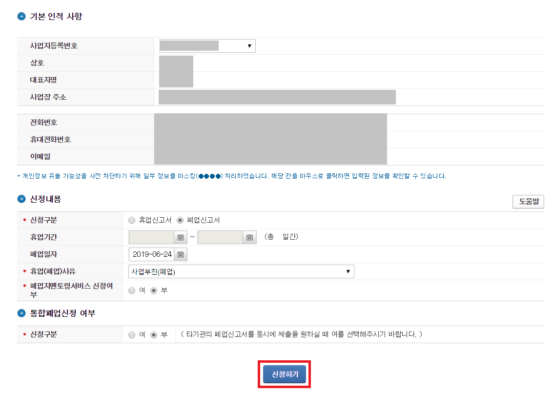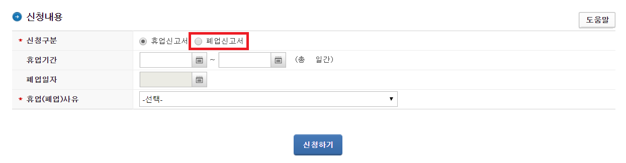 인증 이후에는 바로 [폐업신고서]에 체크를 하여 폐업 신고를 진행할 수 있습니다.