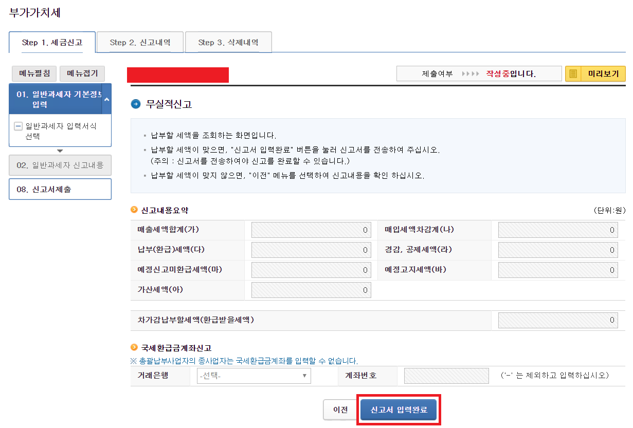저는 최근 과세기간 동안에 사업 실적이 없기 때문에, 다음과 같이 [부가가치세 신고]에서 무실적 신고를 하게 되었습니다.