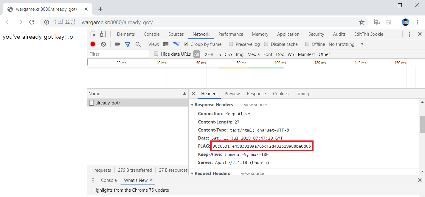 웹 페이지에 접속하면 다음과 같이 이미 Key 값을 얻었다는 메시지가 나옵니다. 그렇다면 서버로부터 이미 Key를 전달 받았다는 의미로 이해할 수 있습니다.