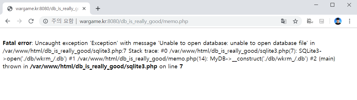 오류 메시지를 확인해 보시면 다음과 같이 데이터베이스 파일을 열 수 없다고 하네요. 아무래도 SQL Lite을 이용하여 로컬 데이터베이스를 관리하고 있는 것 같고, 각 채팅방에 따른 DB 파일을 생성하여 거기에 기록하는 것 같습니다. 오류 메시지를 확인해 보시면 DB 파일의 경로는 ./db/wkrm_{채팅방 이름}.db이네요.