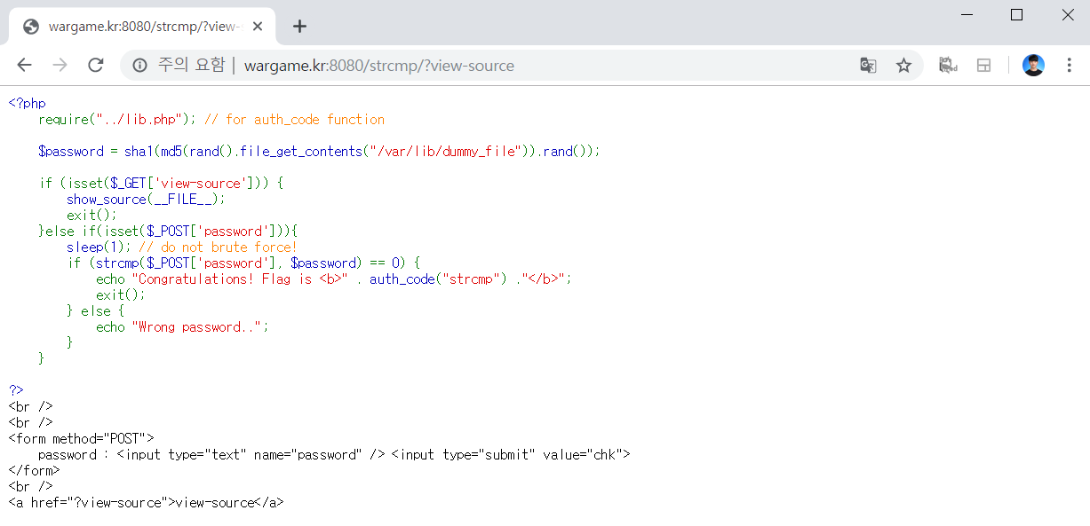 PHP에서 strcmp() 함수에 대한 문제인 것 같습니다. 마찬가지로 문제 유형은 웹 해킹이 되겠습니다.