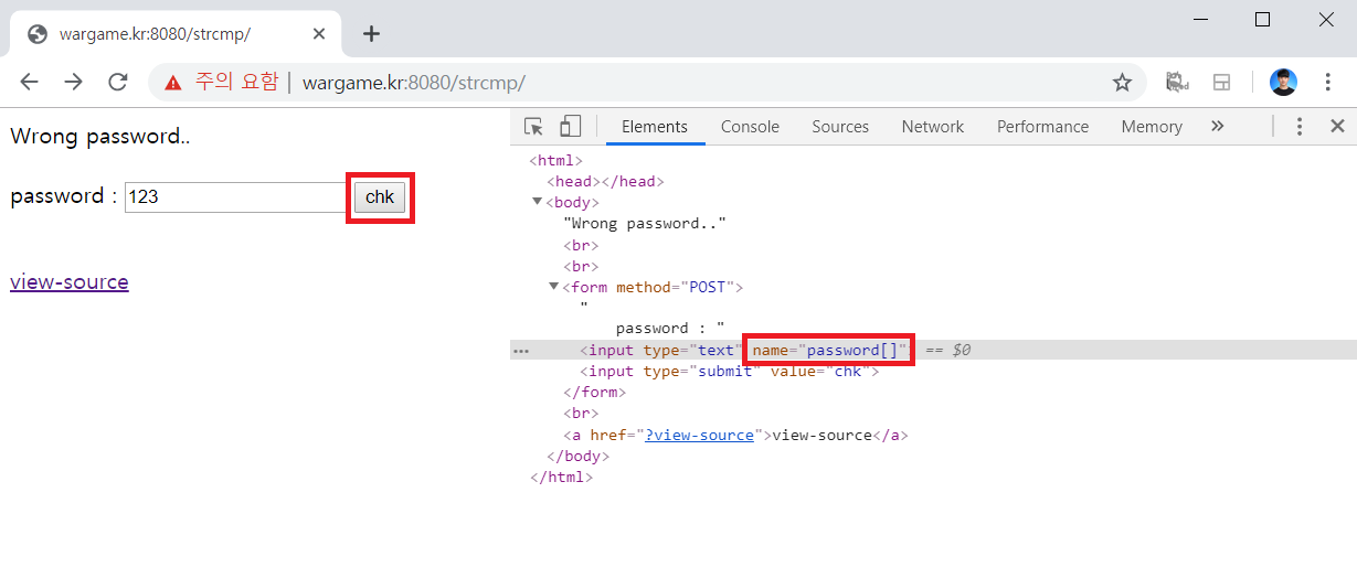 따라서 다음과 같이 개발자 도구(F12)를 실행하여 보내는 데이터의 형태를 password[]로 배열 형태로 변경하여 전송할 수 있습니다. 그러면 아무런 값이나 보내도 결과적으로 필터링을 우회할 수 있을 것입니다.